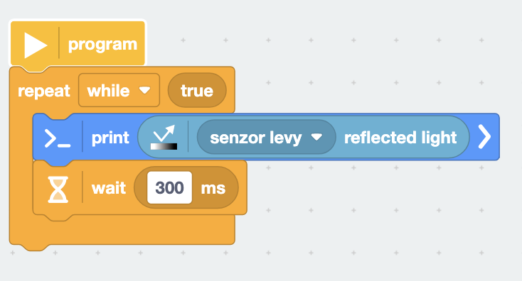 # pybricks blocks file:{"blocks":{"languageVersion":0,"blocks":[{"type":"blockGlobalSetup","id":"bjK,wS1MYO7aiYkFSwd{","x":4,"y":51,"deletable":false,"next":{"block":{"type":"variables_set_prime_hub","id":"{)WuTTGMSJwLS.H*~PKI","extraState":{"optionLevel":1},"fields":{"VAR":{"id":"0ac8)M*M0@okqL6j*T]k"}},"inputs":{"AXIS_TOP":{"shadow":{"type":"blockParametersAxis","id":"G~~=qPiIM)z4Qy;ugq.J","fields":{"VALUE":"z"}}},"AXIS_FRONT":{"shadow":{"type":"blockParametersAxis","id":"=O,F=r_j:y!5C6~`*A2D","fields":{"VALUE":"y"}}}},"next":{"block":{"type":"variables_set_motor","id":"S?(a.C=~LVoJ~3YRo;}.","fields":{"VAR":{"id":"9-KY1{EjNJxUixuEoYJ?"}},"inputs":{"PORT":{"shadow":{"type":"blockParametersPort","id":"pE~{$Zwzpz`i_VDqm^ab","fields":{"NAME":"A"}}},"POSITIVE_DIRECTION":{"shadow":{"type":"blockParametersDirection","id":"VrW-zLpmx[j,+8v+,L[1","fields":{"SELECTION":"Direction.COUNTERCLOCKWISE"}}}},"next":{"block":{"type":"variables_set_motor","id":"3,Y?*Mn1@v9fJ`yYW6Sf","fields":{"VAR":{"id":"@(Mc?VKF9P+IVA!,)0R;"}},"inputs":{"PORT":{"shadow":{"type":"blockParametersPort","id":"r`9bbROX1dwatV7O$.:`","fields":{"NAME":"E"}}},"POSITIVE_DIRECTION":{"shadow":{"type":"blockParametersDirection","id":"Fk;M%s,~BY}0ww1j30bP","fields":{"SELECTION":"Direction.CLOCKWISE"}}}},"next":{"block":{"type":"variables_set_motor","id":"^b]cQj|TmdV%cZJhl0gI","fields":{"VAR":{"id":"#~*U;Y3)}OaA),GbQ/cW"}},"inputs":{"PORT":{"shadow":{"type":"blockParametersPort","id":"?.^x_gX%wU.Xv.#3wRPP","fields":{"NAME":"D"}}},"POSITIVE_DIRECTION":{"shadow":{"type":"blockParametersDirection","id":"0Np/F+n#MjwgBk{6MrPK","fields":{"SELECTION":"Direction.CLOCKWISE"}}}},"next":{"block":{"type":"variables_set_motor","id":"I#`Wxj%/1]|h{X+ZQ;3Y","fields":{"VAR":{"id":"xE_y9@2/n%+##W#h*hFj"}},"inputs":{"PORT":{"shadow":{"type":"blockParametersPort","id":"j1eKhU`bdoHdh)~]Hl2b","fields":{"NAME":"C"}}},"POSITIVE_DIRECTION":{"shadow":{"type":"blockParametersDirection","id":"|$c/*_TuT!~8{cQFN{[f","fields":{"SELECTION":"Direction.CLOCKWISE"}}}},"next":{"block":{"type":"variables_set_drive_base","id":"B@6q{(N{H$OlQN@o(=#7","fields":{"VAR":{"id":"/@.Q%T4BjtqKCq7$UAbr"}},"inputs":{"VAR":{"shadow":{"type":"variables_get_motor_device","id":"h-`^(Zu#NTvZ*mW#2vcD","fields":{"VAR":{"id":"9-KY1{EjNJxUixuEoYJ?","name":"kolo leve","type":"Motor"}}}},"VAR2":{"shadow":{"type":"variables_get_motor_device","id":"CD5,af-R[yO,bE]-?Uf_","fields":{"VAR":{"id":"@(Mc?VKF9P+IVA!,)0R;","name":"kolo prave","type":"Motor"}}}},"VALUE0":{"shadow":{"type":"unit_distance","id":"GNgo@U(M|24Obsy~%4x{","fields":{"VALUE0":88}}},"VALUE1":{"shadow":{"type":"unit_distance","id":"cIT+~l^nylC1%}(,bsKB","fields":{"VALUE0":144}}}},"next":{"block":{"type":"variables_set_color_sensor","id":"0]Gny{r@pu-me0u.qL+H","extraState":{"optionLevel":0},"fields":{"VAR":{"id":"4q7cl%:FR{.%!.~b;=4j"}},"inputs":{"PORT":{"shadow":{"type":"blockParametersPort","id":"HrOt9)|o*,]VPV8SDZ9E","fields":{"NAME":"B"}}}},"next":{"block":{"type":"variables_set_color_sensor","id":"x.AGwFp0|}^R*%F(%TcG","extraState":{"optionLevel":0},"fields":{"VAR":{"id":"^z-R_D5t#~Oky5)7@fjS"}},"inputs":{"PORT":{"shadow":{"type":"blockParametersPort","id":"I!+TlWLqzTDYY6^$uKdf","fields":{"NAME":"F"}}}}}}}}}}}}}}}}}}}}},{"type":"blockGlobalStart","id":"3tJe|AWl0baN(wH9a$@.","x":990,"y":44,"deletable":false,"next":{"block":{"type":"blockDriveBaseUseGyro","id":"W=Lm:RpeA}v?nKUf*^6.","fields":{"METHOD":"DRIVEBASE_USE_GYRO_TRUE"},"inputs":{"VAR":{"shadow":{"type":"variables_get_drive_base_device","id":"i{6(E*p~D3tY|M-^UtvG","fields":{"VAR":{"id":"/@.Q%T4BjtqKCq7$UAbr","name":"drive base","type":"DriveBase"}}}}},"next":{"block":{"type":"blockDriveBaseConfigure","id":"g3I/xPp1/oeRSee5-LA^","extraState":{"optionLevel":1},"fields":{"METHOD":"DRIVEBASE_STRAIGHT_SPEED"},"inputs":{"VAR":{"shadow":{"type":"variables_get_drive_base_device","id":"Z+6V|uC*Z3_Z4Pd$0di/","fields":{"VAR":{"id":"/@.Q%T4BjtqKCq7$UAbr","name":"drive base","type":"DriveBase"}}}},"ARG0":{"shadow":{"type":"unit_speed","id":"oc%m!QtUlj%nS}0wUkdH","fields":{"VALUE0":500}}}},"next":{"block":{"type":"blockFlowWhile","id":"^w![3wsmge-,nl%)9)_2","fields":{"MODE":"WHILE"},"inputs":{"BOOL":{"shadow":{"type":"blockLogicTrue","id":"|%RuaCQaVxPi_*BB*Hea"},"block":{"type":"blockLogicCompare","id":"0-l;i-(OX+f@B$[%Nv?7","fields":{"OP1":"GT"},"inputs":{"A":{"shadow":{"type":"blockMathNumber","id":"0R9k4vfG#^mUZ#xuV!Yy","fields":{"NUM":3}},"block":{"type":"blockLightReflection","id":"xPaTrirocgrfw:z($hfN","inputs":{"VAR":{"shadow":{"type":"variables_get_light_intensity_device","id":"DOR_9uhk=S}7mpH~6ny:","fields":{"VAR":{"id":"4q7cl%:FR{.%!.~b;=4j","name":"senzor levy","type":"ColorSensor"}}}}}}},"B":{"shadow":{"type":"blockMathNumber","id":"=Fis}(OW{eVsQ%GL+Xv?","fields":{"NUM":20}}}}}},"DO":{"block":{"type":"blockDriveBaseDrive2","id":"e!qh#u{yRC]5T}d88!wD","extraState":{"optionLevel":2},"fields":{"METHOD":"DRIVEBASE_DRIVE_STRAIGHT"},"inputs":{"VAR":{"shadow":{"type":"variables_get_drive_base_device","id":"Fn3J0txHNG:z99+vK!pI","fields":{"VAR":{"id":"/@.Q%T4BjtqKCq7$UAbr","name":"drive base","type":"DriveBase"}}}},"ARG0":{"shadow":{"type":"unit_distance","id":"Zf;zZ*m@T_Mm5%_U]r.u","fields":{"VALUE0":50}}},"ARG1":{"shadow":{"type":"parameters_stop_4","id":"m4%XtpLADnb=l]x@*bmt","fields":{"VALUE":"Stop.NONE"}}}}}}},"next":{"block":{"type":"blockDriveBaseStop","id":"FQcgVD9TN#4W;ib{Q}Dj","inputs":{"VAR":{"shadow":{"type":"variables_get_drive_base_device","id":"sJ%~bnFg:!9s?/VX*/M(","fields":{"VAR":{"id":"/@.Q%T4BjtqKCq7$UAbr","name":"drive base","type":"DriveBase"}}}},"VALUE0":{"shadow":{"type":"parameters_stop_3","id":"ELOu@BWpK(Ie4(+d)AL_","fields":{"VALUE":"Stop.HOLD"}}}}}}}}}}}}}]},"variables":[{"name":"red","id":"^TRnlnrf1|b]54?=RSAE","type":"ColorDef"},{"name":"orange","id":"T/Ga=6s={mOa/4,vyj]{","type":"ColorDef"},{"name":"yellow","id":"z6p)=?w#+g|y@lU:VFt*","type":"ColorDef"},{"name":"green","id":"PQR$ys-f%#*T_4`Rx0fH","type":"ColorDef"},{"name":"cyan","id":"n3GEOv6@N!|xg_x}=G
